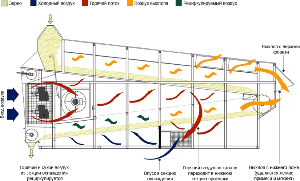Зерно просушивается очень равномерно . Принцип конвейера обеспечивает одинаковую контролируемую продолжительность просушки всего зерна для любых культур различной влажности. Полное перемешивание зерна достигается за счёт направления движения зернового потока сверху вниз.